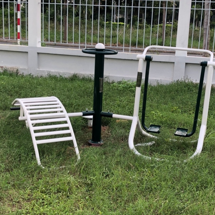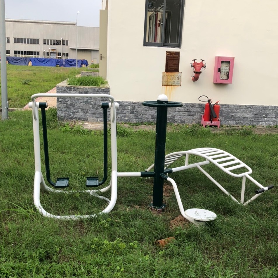 - Cụm vận động đi bộ, tập lưng, xoay eo NT-644 là dụng cụ thể dục ngoài trời kết hợp 3 trong 1, 3 người có thể cùng tập cùng một lúc các bài tập đi bộ, tập lưng và xoay eo.