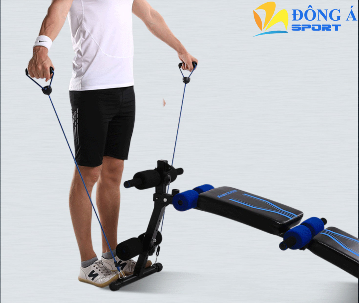 - Ngoài chức năng tập cơ bụng chuyên dụng, ghế tập còn có thêm dây đàn hồi và dây kéo lò xo trên.