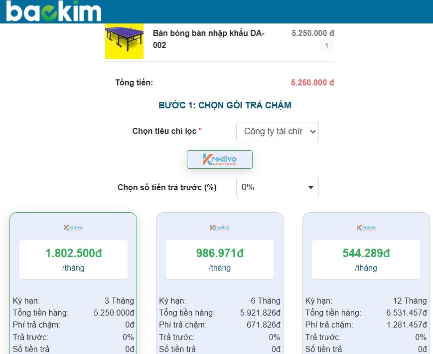 Bạn đang muốn mua bàn bóng bàn trị giá 4.000.000đ và trả góp 3 tháng, tài khoản Kredivo của bạn là Basic.