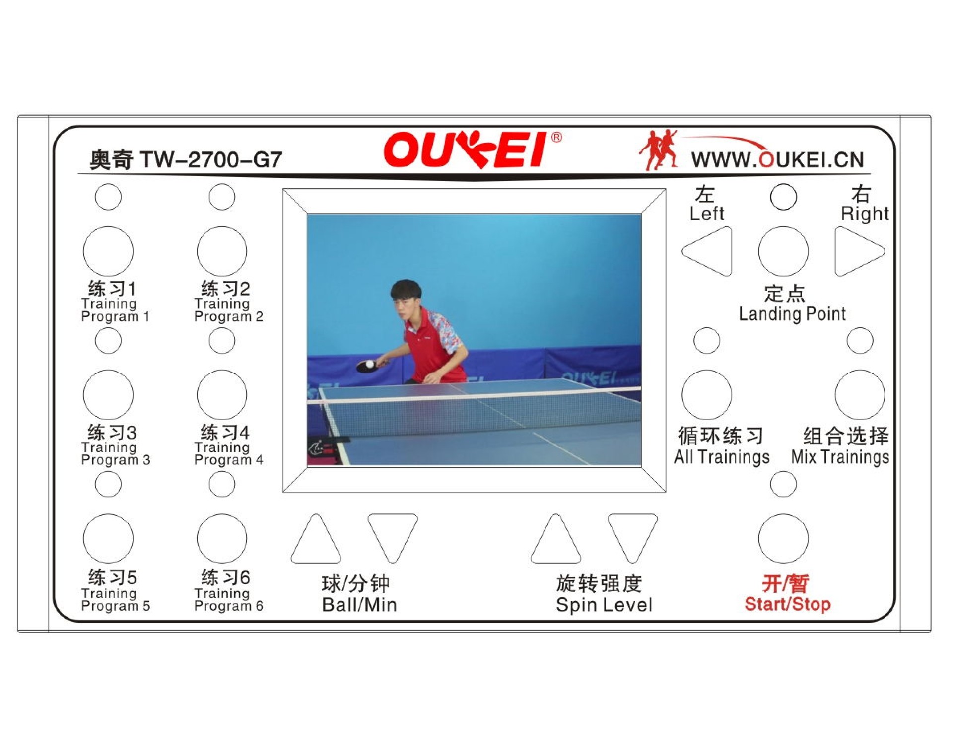Máy bắn bóng Oukei TW2700-G7 phù hợp với mọi trình độ của người chơi và hoàn hảo cho những ai muốn trau dồi kỹ năng chơi bóng bàn của mình. Máy được trang bị một màn hình màu LCD trên bảng điều khiển, cho thấy điểm rơi của bóng theo từng bài tập mẫu. Máy có 6 chương trình tích hợp, 9 kiểu xoáy, với 5 điểm rơi khác biệt trên bàn.