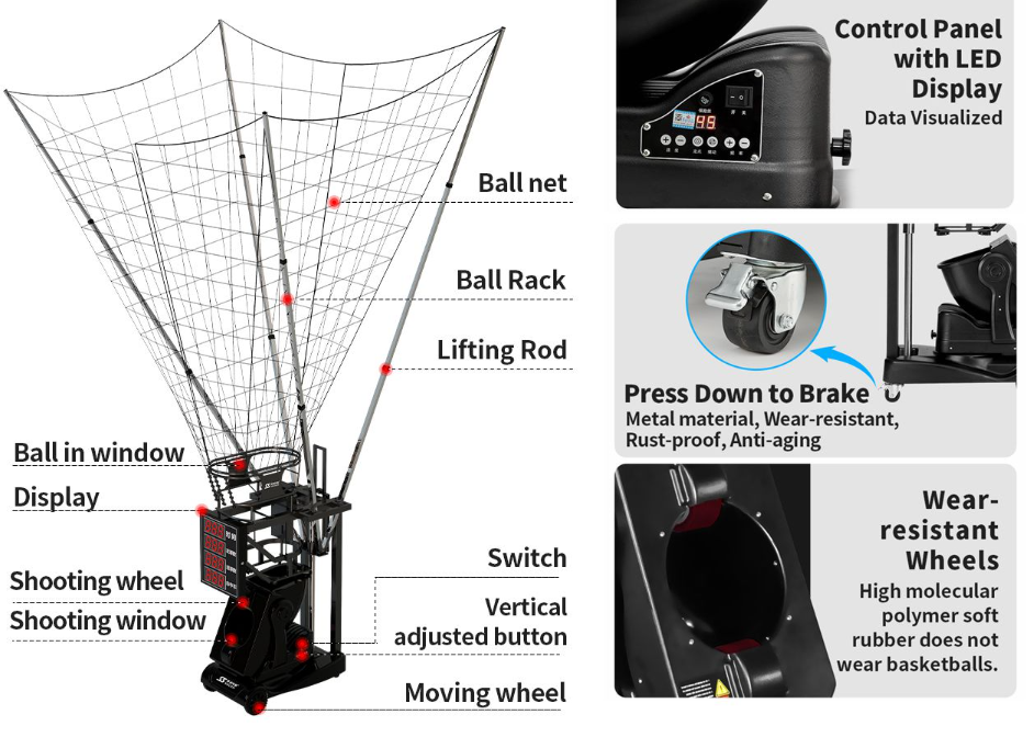 Đa dạng chế độ tập luyện: Từ bài tập cố định, bài tập xoáy, đến bài tập ngẫu nhiên, máy hỗ trợ nhiều chế độ bắn bóng, giúp bạn luyện tập các kỹ năng ném rổ từ mọi vị trí trên sân, từ ném gần rổ đến ném 3 điểm.