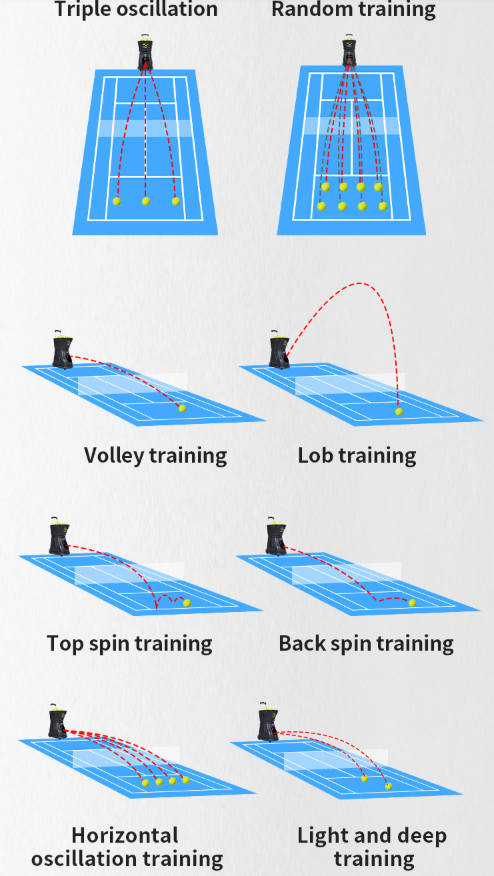 Mô phỏng thực chiến đa dạng: Máy có khả năng bắn bóng cao, bắn 3 đường (3-line ball), cùng các chế độ bắn cố định, ngẫu nhiên, xoáy trên, xoáy dưới, giúp bạn luyện tập mọi kỹ năng từ đánh thuận tay, trái tay, volley, đến cải thiện phản xạ và di chuyển trên sân.