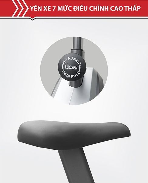 - Yên xe được bọc nệm da cao cấp đem lại cảm giác êm ái cho người luyện tập. Điểm đặc biệt là yên có thể điều chỉnh độ cao thấp với 7 mức khác nhau phù hợp với chiều cao của đa số mọi người.